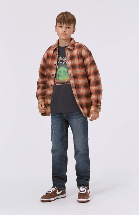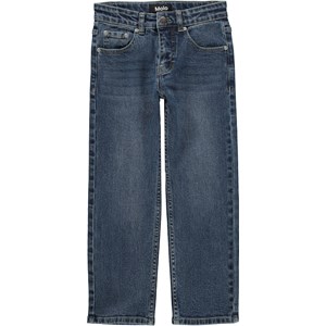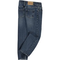 Indigo blue jeans with stretch. These jeans are constructed in a stretchy cotton, so active play will never be a problem. The jeans have side pockets, back pockets and are in a regular fit. The waist can be adjusted with inner elastic so they fit all children perfectly. Sizes 92-134 have a snap closure to make them easy to pull on and off. Sizes 140-176 have a regular jeans button..