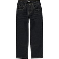 Dark blue jeans in a dark wash. These jeans are constructed in cotton and have a fleece lining, making them soft and warm on really cold days. They have side pockets, back pockets and are in a regular fit. The waist can be adjusted with inner elastic so they fit all children perfectly. Sizes 92-134 have a snap closure to make them easy to pull on and off. Sizes 140-176 have a regular jeans button.