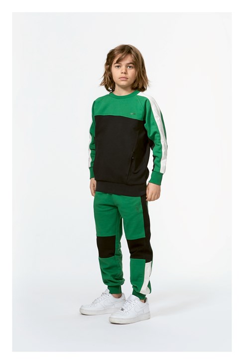 Awer is a pair of sweatpants in green with black and white details. They have an elastic waist and rib at the legs. Wear them with a matching sweatshirt.