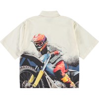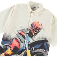 Beige shirt in soft organic cotton with wide t-shirt sleeves, classic shirt collar, and button fastening at the front. The shirt is oversized with a front and back print of a colourful motocross rider.