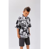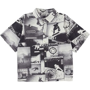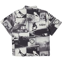 Richie is a short sleeve shirt with a print of various pictures where skaters are on ramps all around the world. The shirt has a collar and a button front closure.