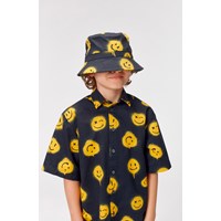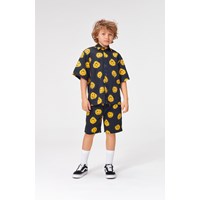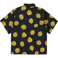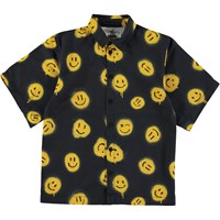 Richie is a black short sleeve shirt with yellow graffiti smiley faces all over. Rio has black buttons.