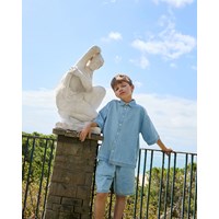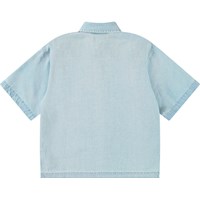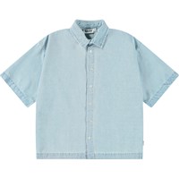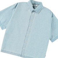 Oversized light blue denim shirt in soft organic cotton with wide t-shirt sleeves, classic shirt collar, and button fastening on the front.
