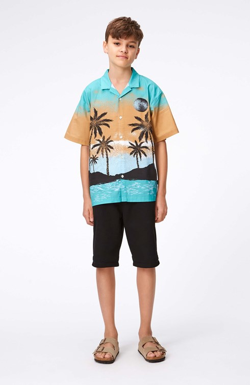 Rui is a short sleeve shirt in 100% organic cotton with a placement print. The print is a classic Hawaii motif in sand tones and black and turquoise. It has palm trees in front of a sunset. This shirt has short sleeves, a button front closure and is in a regular fit. For an extra cool look, you can wear it with the matching Adi shorts in the same print.