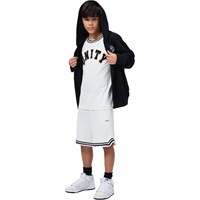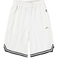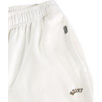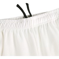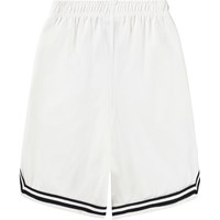 Soft shorts in white with black details, made of organic cotton. The shorts have a loose fit and reach around the knee. They have side pockets, back pocket, and elastic and drawstring at the waist which makes it comfortable and easy to move in.