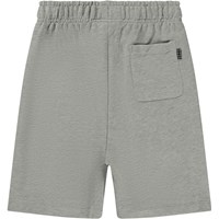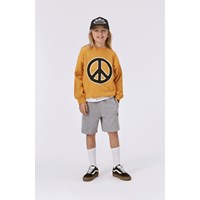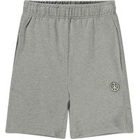 Grey melange sweatshorts with a peace sign. These shorts are constructed in a soft, comfortable cotton blend. The shorts finish at the knees and have elastic with contrast-coloured inner ties at the waist. They have side pockets and a pocket on the back. The shorts are in a regular fit.