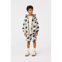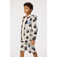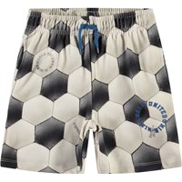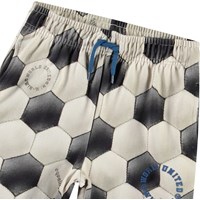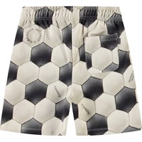 Organic cotton sweatshorts. The shorts have a regular fit, reach the knee, and have wide legs. They have an elastic waistband with an inner drawstring, as well as pockets on the sides and a single back pocket. Football print in black and white with a raised round rubber print on one leg with the text 'World United Win Win'.