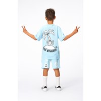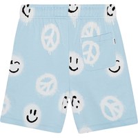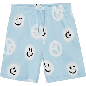 Adian is a pair of light blue sweat shorts in 100% organic cotton with a white and black all over print. The print is of a lot of smiling faces and peace signs that look like they are spray painted, and together, they are spreading the message of 'More Love'. The shorts end at the knee, have wide legs and an elastic waist with a drawstring. They have side pockets, a single back pocket, and they are in a regular fit. For an extra cool look, you could wear them with Miksi, the matching sweatshirt, in the same print.