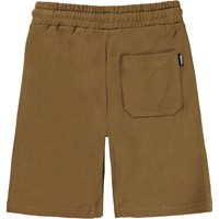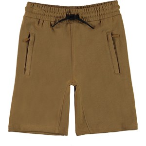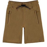 Aliases is a pair of light brown shorts in organic cotton. The front has pockets with hidden zippers, and there is a single pocket on the back. Aliases has black ties at the waist.
