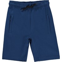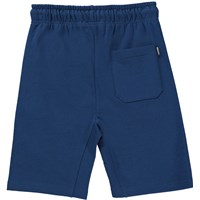 Aliases is a pair of dark blue shorts in organic cotton. There are front pockets with concealed zippers, and the back has a single pocket. Aliases has a white drawstring at the waist.