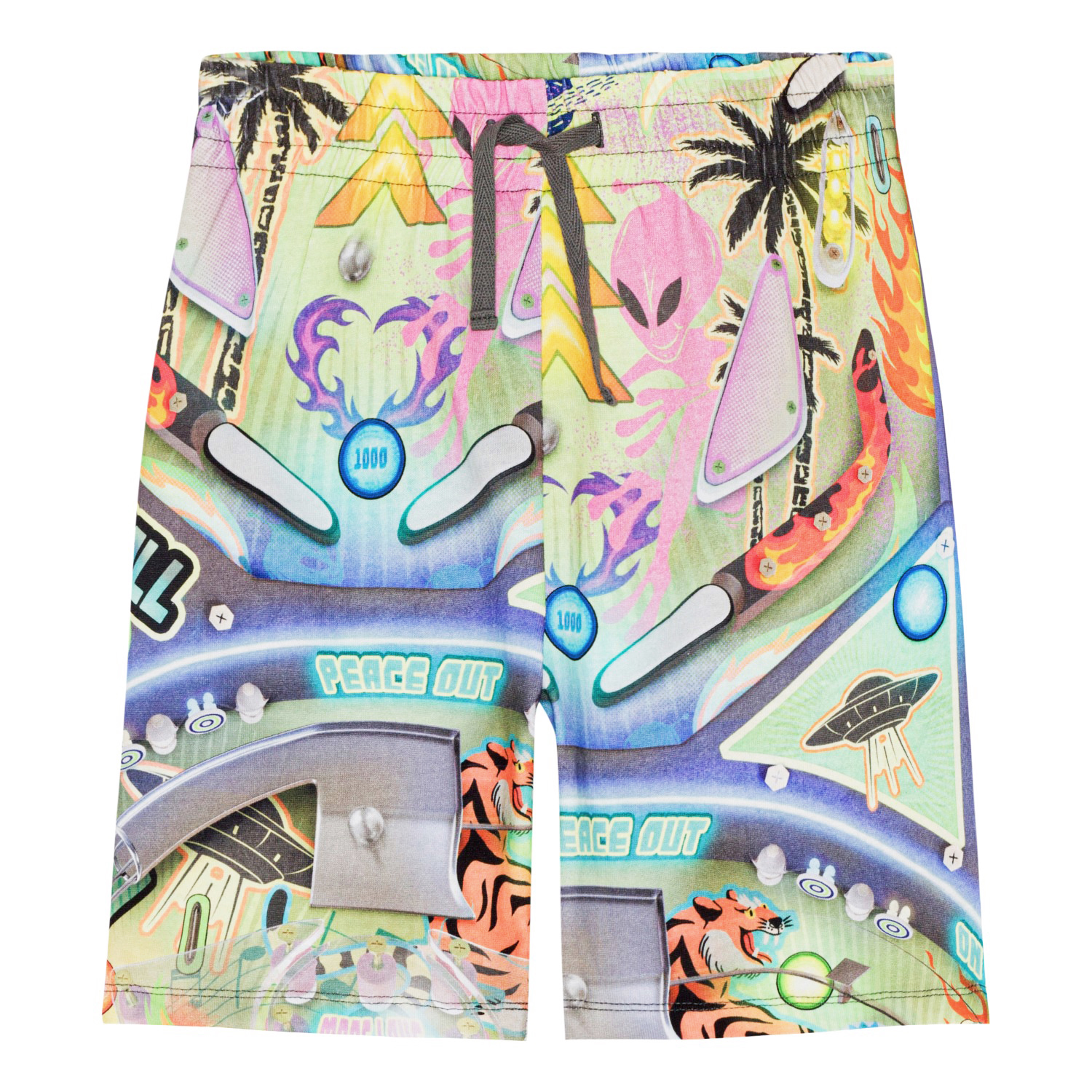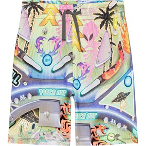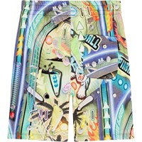 Shorts in organic cotton with a multi-coloured, all over pinball print. The shorts are knee length and are in a regular fit with an adjustable elastic waist. They have side seam pockets and a single back pocket.