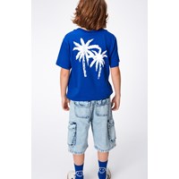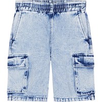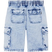 Long, blue denim shorts in an acid wash look. The shorts are knee length and are in a loose fit. They have side seam pockets, cargo pockets on the legs and a single back pocket. The shorts have an adjustable elastic waist.
