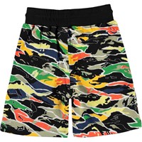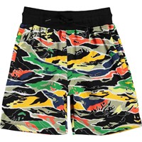 Alw is a pair of sweat shorts in a multi-coloured camouflage print. Alw has front pockets and rib with ties at the waist.