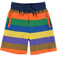 Alwy is a pair of shorts with wide, multi-coloured stripes. Alwy has two side pockets and an elastic waist with ties.