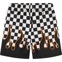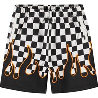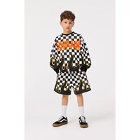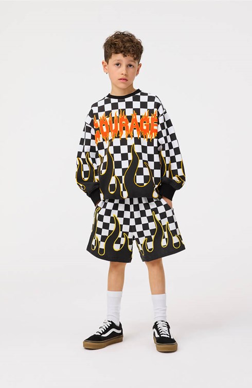 Shorts in organic cotton jersey. The shorts are knee-length, have pockets at the front, and have a loose fit with an elastic waist, making them comfortable to wear. They feature a print of motocross stars and flames. For a complete outfit, pair with a matching sweatshirt.