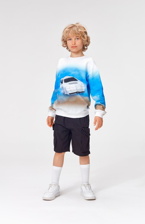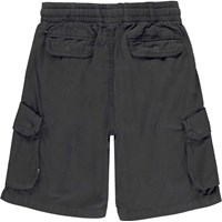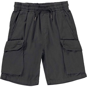 Argod is a pair of long black cargo shorts with large pockets at the sides. They have two back pockets and an elastic waist with ties for a comfortable fit.
