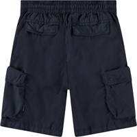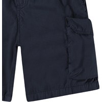Dark blue cargo shorts in organic cotton. These shorts have an elastic waist, internal drawstring, and regular fit. They also feature back pockets, side pockets, and a pocket on each thigh.