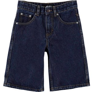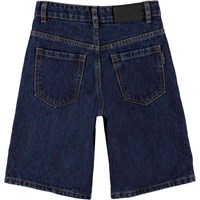 Art is a pair of knee length denim shorts in a dark blue wash. The shorts have front and back pockets and a black leather logo patch on the back. This Molo product is made of certified organic cotton.