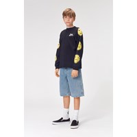 Art is a pair of knee length denim shorts in a light stone wash. The shorts have front and back pockets and a black leather logo patch on the back. This Molo product is made of certified organic cotton.
