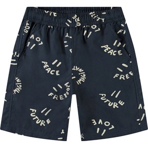 Knee-length shorts in organic cotton. The shorts have an elastic waist, pockets on the sides, a back pocket, and a loose, baggy fit. Blue with a print of smiling faces and cool statements. Pair with a matching shirt for a cool outfit.