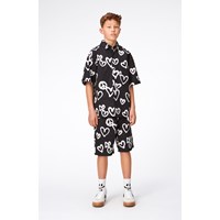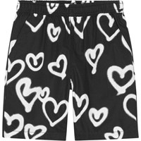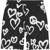 Black, knee length shorts in cotton. They have elastic at the waist, side pockets, a back pocket, and they are in a baggy fit. The shorts are in an all over print of white graffiti hearts. For a cool set, wear them with a matching shirt.