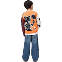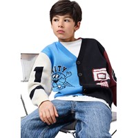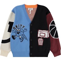 Multicoloured knitted cardigan made of organic cotton with a V-neck, ribbed edges at the neck, sleeves and bottom, and buttons at the front. The cardigan is decorated with colourful figures and elements inspired by the world of basketball to give it a playful and sporty expression.