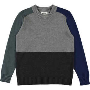 Buzz is a colour-blocked knit top with two grey colours on the front and with blue and green sleeves.
