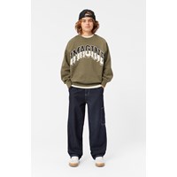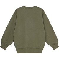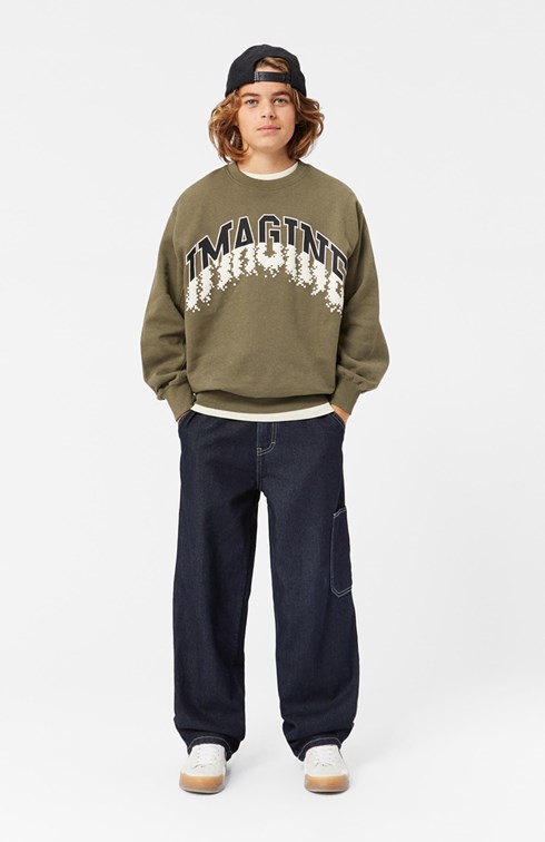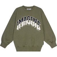 Army green sweatshirt in organic cotton with low shoulder seams, long sleeves, a round neck, and ribbed edges. The sweatshirt has a loose fit and a brushed inner face, making it soft and warm to wear. Black/white text print of "Imagine", where the bottom part of the text appears to crumble into pixels.