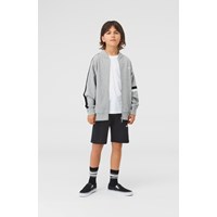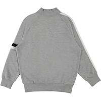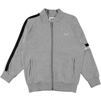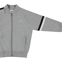 Manco is a grey sporty top with a front zip closure. The top has stripes down one sleeve and across the other sleeve.