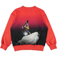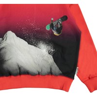 Mann is a red sweatshirt with a print of a cool snowboarder on the front. It has a round neck and an elastic rib edge at the bottom and sleeves.