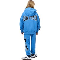 Blue hoodie made of soft cotton with a kangaroo pocket, front zip and ribbed edges at the sleeves and bottom. The hoodie has a loose, relaxed fit with a print on the front, sleeve and back with the text 'Únity'.