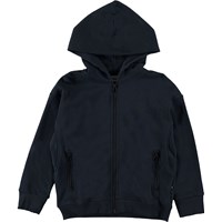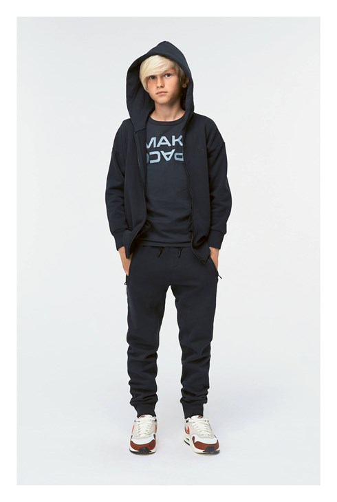 Mash is a dark blue hoodie with a zip closure and zip pockets. Complete the outfit with matching trousers for a relaxed and cool look.