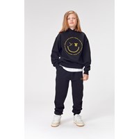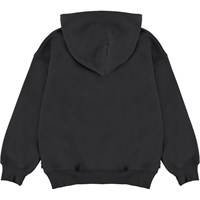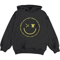Matt is a black sweatshirt hoodie with yellow text formed as a smiling face. Matt has rib at the wrists and waist. This Molo product is made of certified organic cotton.