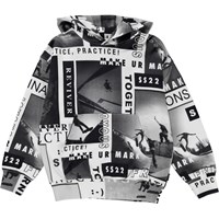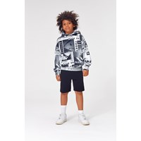 Matt, in the "SK8 News" print, is in a sweatshirt hoodie in a black/white skater newspaper print. Matt has pockets on the stomach and rib at the wrists and waist.