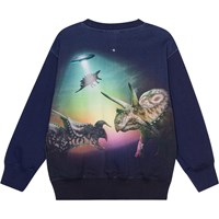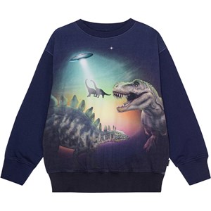 Dark blue organic sweatshirt in a colourful print of dinosaurs in the foreground and two dinosaurs in the background that are being beamed up into a UFO. There are even more dinosaurs on the back. It is in a regular fit and has a round neck with a rib edge and rib at the sleeves and bottom.