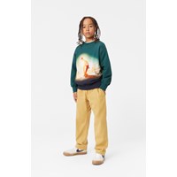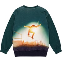 Dark green sweatshirt in organic cotton with a round neckline and ribbed cuffs and hem. The sweatshirt has a regular fit and a placement print on both the front and back, showing skaters riding a ramp. The top has a brushed inner face, making it soft and warm to wear.