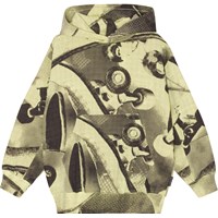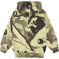 Yellow and black organic hoodie in an all over skater print. It's a 2-toned abstract print of an almost life size skateboard. The hoodie has a pouch pocket and rib at the sleeves and bottom. This style is in an oversized fit. If you want a more classic fit, or if your child is between sizes, we recommend you choose one size smaller than normal.