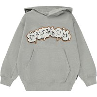 Grey melange hoodie with a graphic embroidery on the front. The embroidery was inspired by the world of skaters and graffiti. Its message is one of "Freedom" and "Peace". This hoodie is constructed in 100% cotton, has a pouch pocket, rib at the sleeves and bottom and is in an oversized fit.
