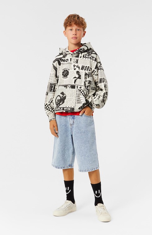 Black hoodie in organic cotton with a hood, pouch pocket, ribbed edges and a brushed inner face, making it lovely, soft and warm to wear. The hoodie has an oversized fit and a placement print on the front inspired by virtual reality, especially VR glasses, which can transport you into a whole different world. If you prefer a more regular fit, we recommend choosing a smaller size than usual, even if the child is between two sizes.