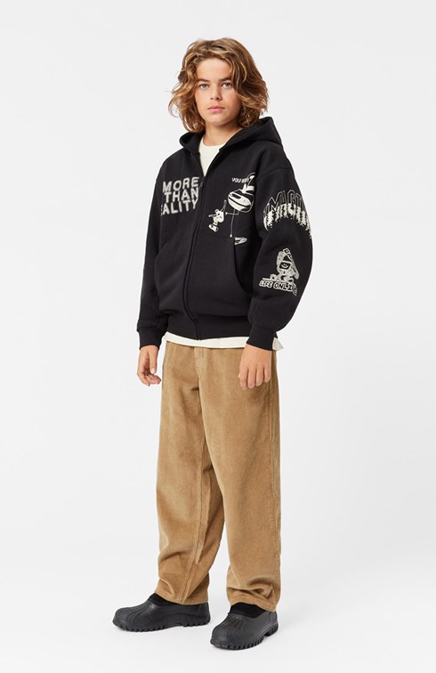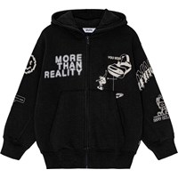 Black and white hoodie in organic cotton with a zip, hood, pouch pocket, and ribbed cuffs and hem. The hoodie has a loose fit and an all-over print. The print is inspired by elements from video games and the virtual world, with white on black.