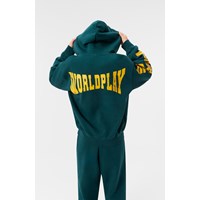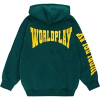 Green hoodie in organic cotton with a zipper, hood, pouch pocket, ribbed edges, and a brushed inner face, making it soft and warm to wear. The hoodie has a loose fit and features a printed "Worldplay" text in a fresh yellow on the chest, back, and down one arm.