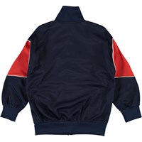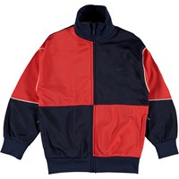 Menwi is a two-coloured track jacket in a blue and red plaid. The jacket has white pipings and a zip closure.