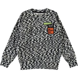 Mik is a sweatshirt in the black and white 'Interference' print. The sweatshirt has small, coloured patches on the front, where one says, 'The future is wild'.