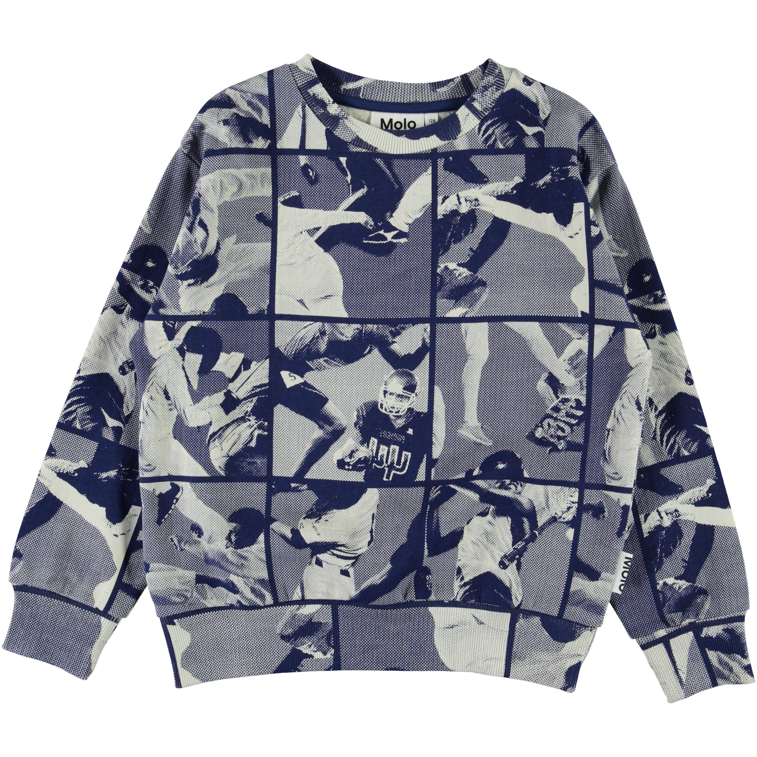 Mik is a blue sweatshirt with sports images divided into different boxes that create a beautiful print.
