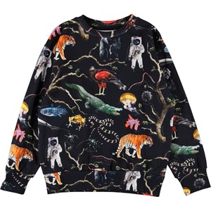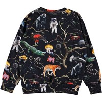 Explore the 'Tree of Life' print on the Mik sweatshirt. There are wild animals and aliens hidden in the print. Mik is 100% cotton and has a black background colour.