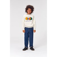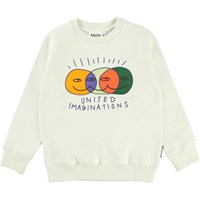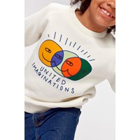 Mike is a white sweatshirt with raglan sleeves. There are three shining smiley faces in the centre and the text "United Imaginations".