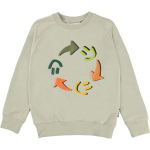 Moon is a grey sweatshirt with a print of many smiley faces going around in circles. Smile at the world in this sweatshirt.