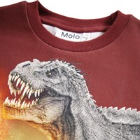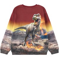 Dark red sweatshirt made of soft organic cotton with ribbed edges around the neck, sleeves and waist. The sweatshirt has a loose fit with a dinosaur print that goes all the way around.