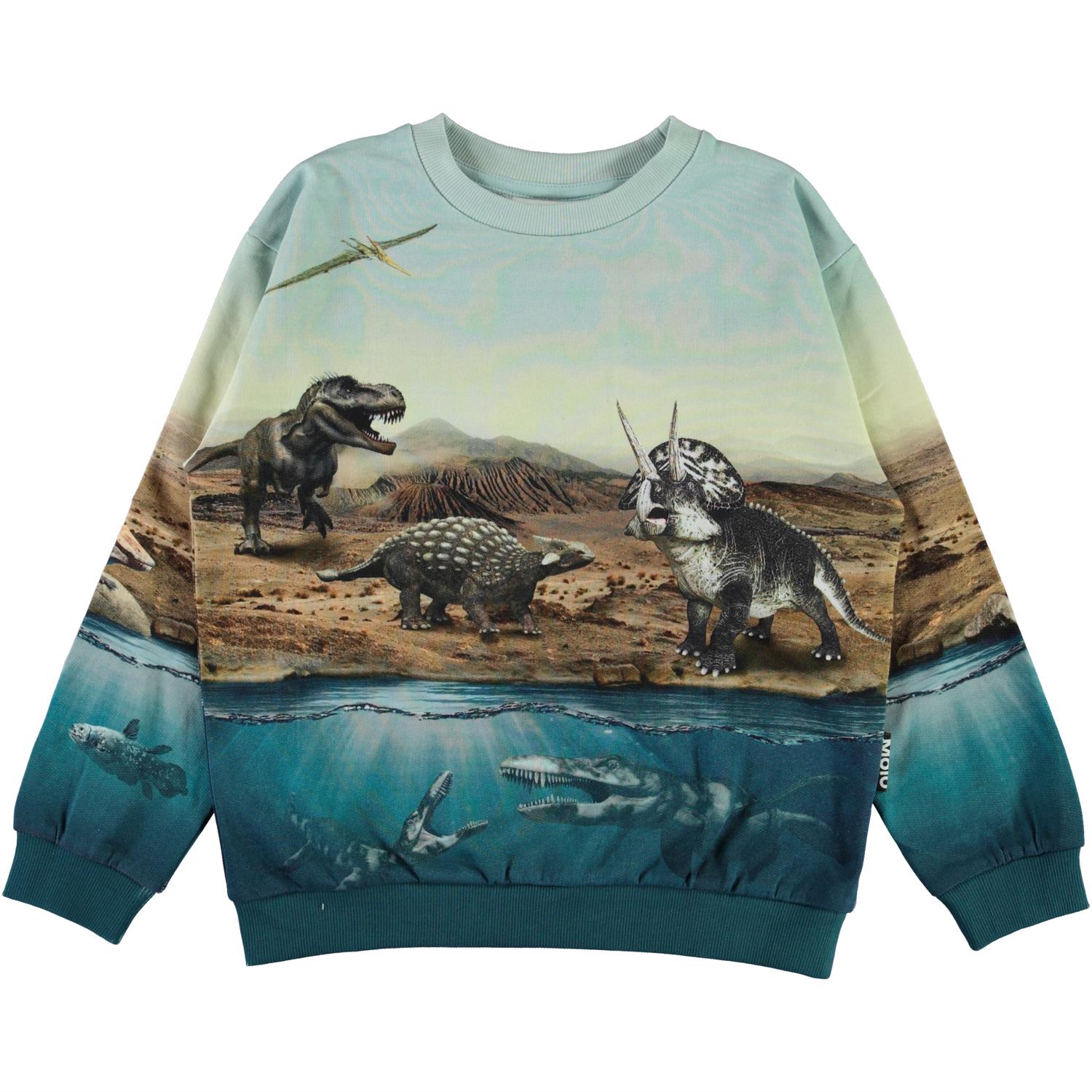 Miksi is a light blue sweatshirt with a print of prehistoric dinosaurs, over and under the water's surface. It has a round neck and elastic rib at the sleeves and bottom.