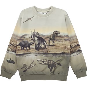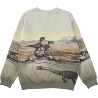 Miksi is a beige sweatshirt with a print of various dinosaurs that live above and below the water. The sweatshirt has rib at the neck, sleeves and bottom.